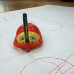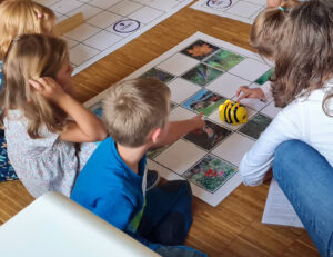 In der Bee-Bot-Gruppe lernten die Kinder spielerisch die ersten Schritte des Programmierens mit Tanja Müller. Dabei wurde ein Maus-Rätsel gelöst, wobei die Kinder sich gegenseitig programmierten. Danach ging es anhand einer Geschichte mit dem Bienen-Roboter auf Schatzsuche. Dabei lernten die Kinder verschiedene Lebensräume (Wiese, Wald, Wasser) und dort lebende Tiere und Pflanzen kennen. Im Anschluss dachte sich jeder seine eigenen Routen mit Hindernissen aus und führte die Biene Schritt für Schritt an Ziel. Auch das Malen mit den Bee-Bots machte den Kindern Spaß.