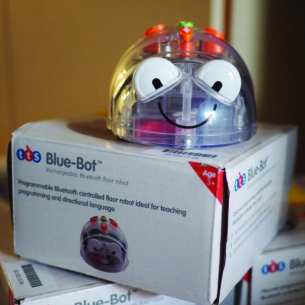 Blue-Bot sieht aus wie Bee-Bot, kann aber neben den 7 Tasten auf der Rückseite auch über Bluetooth mit der App programmiert werden, der Kostenlos heruntergeladen werden kann.
