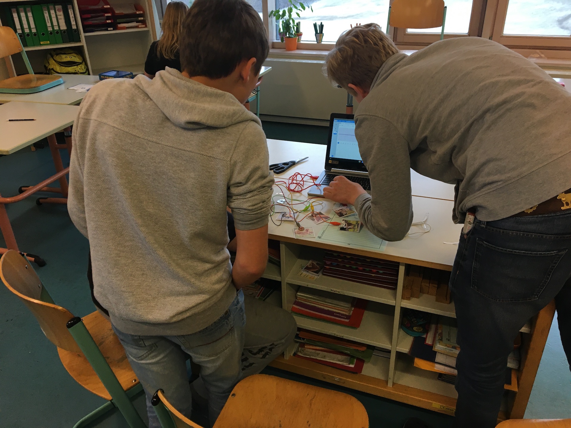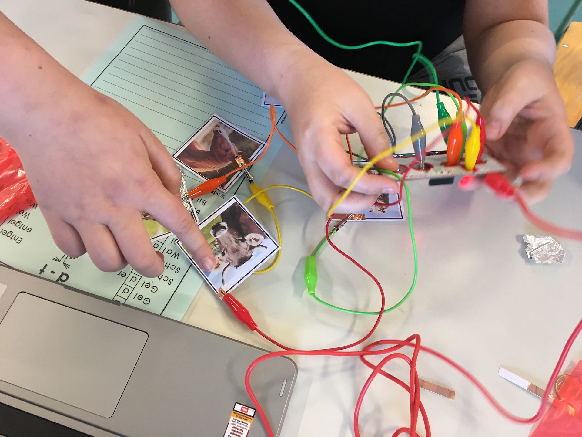 - MakeyMakey schließt und öffnet Stromkreise zwischen einem Menschen und einem Objekt. Dabei arbeitet es mit sehr geringer Spannung, so dass das System ungefährlich ist und man es nicht spürt.