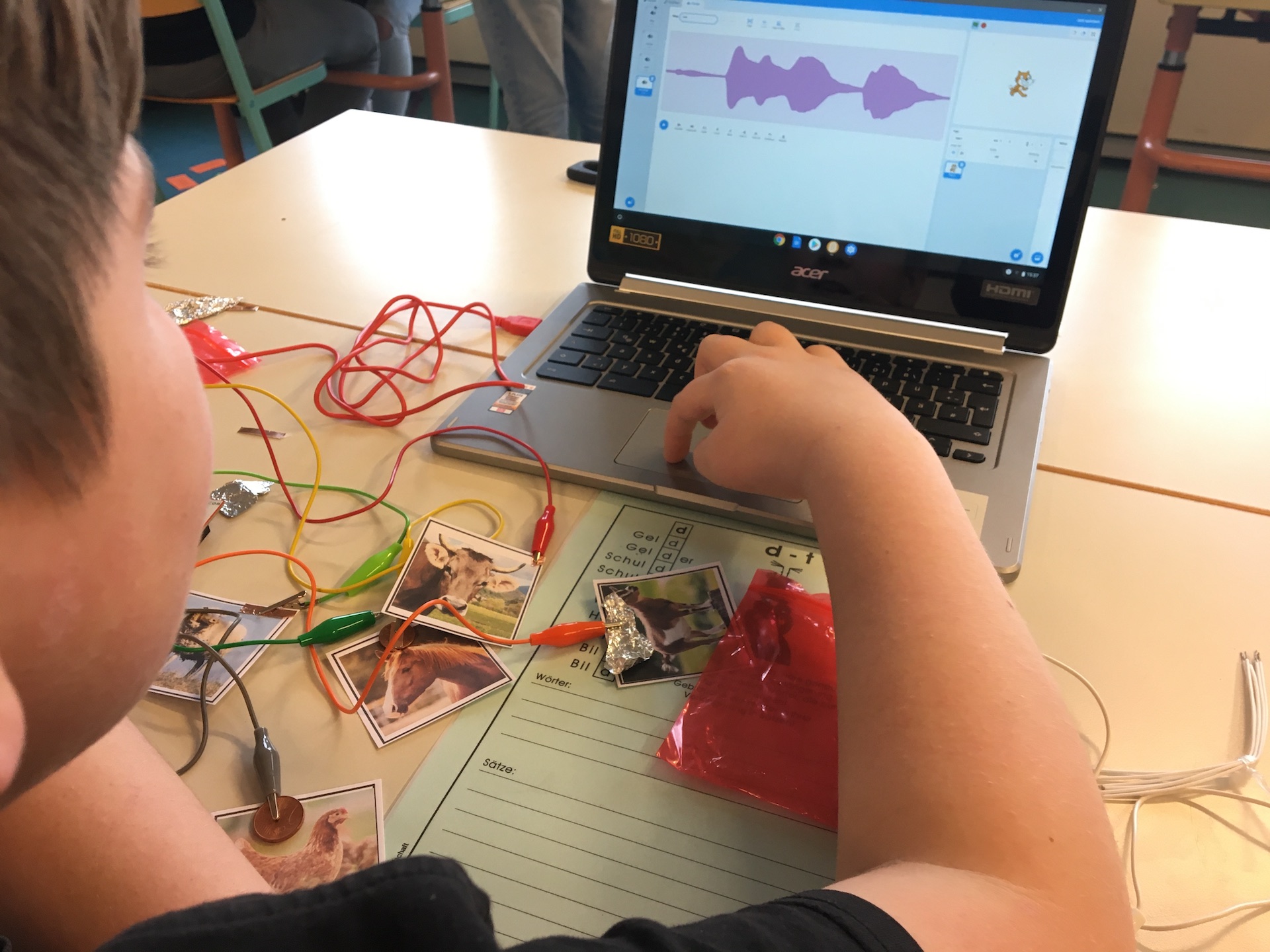 - Man schließt also ein Kabel an ein Objekt, beispielsweise einen Apfel, an, dasselbe tut man mit der eigenen Hand. Berührt man nun den Apfel, wird de Stromkreis geschlossen und das MakeyMakey erkennt, dass eine Taste gedrückt wurde. Dabei benutzt es USB-Anschlüsse, so dass der Computer diesen Apfel als normale Taste einer Tastatur oder einer Maus wahrnimmt.