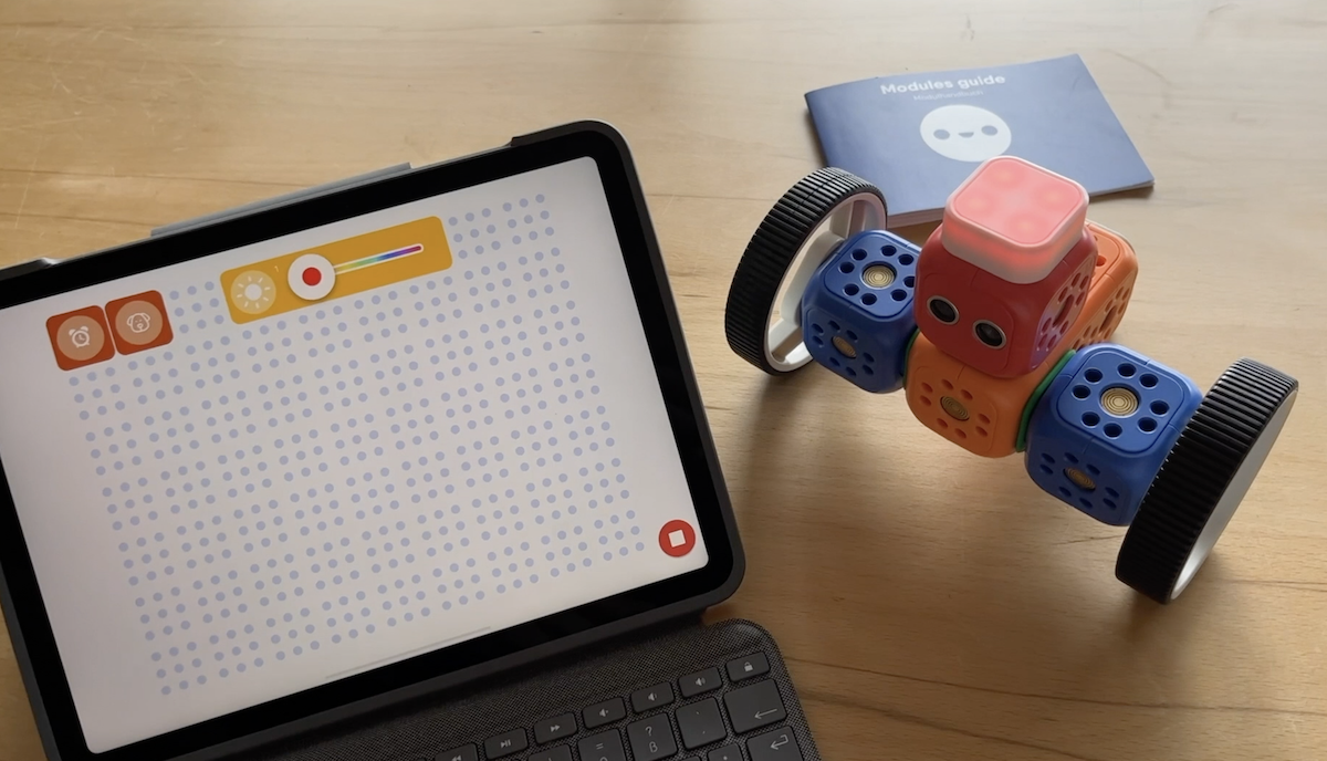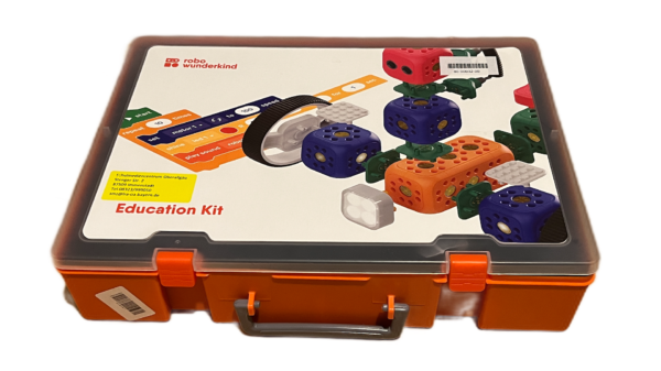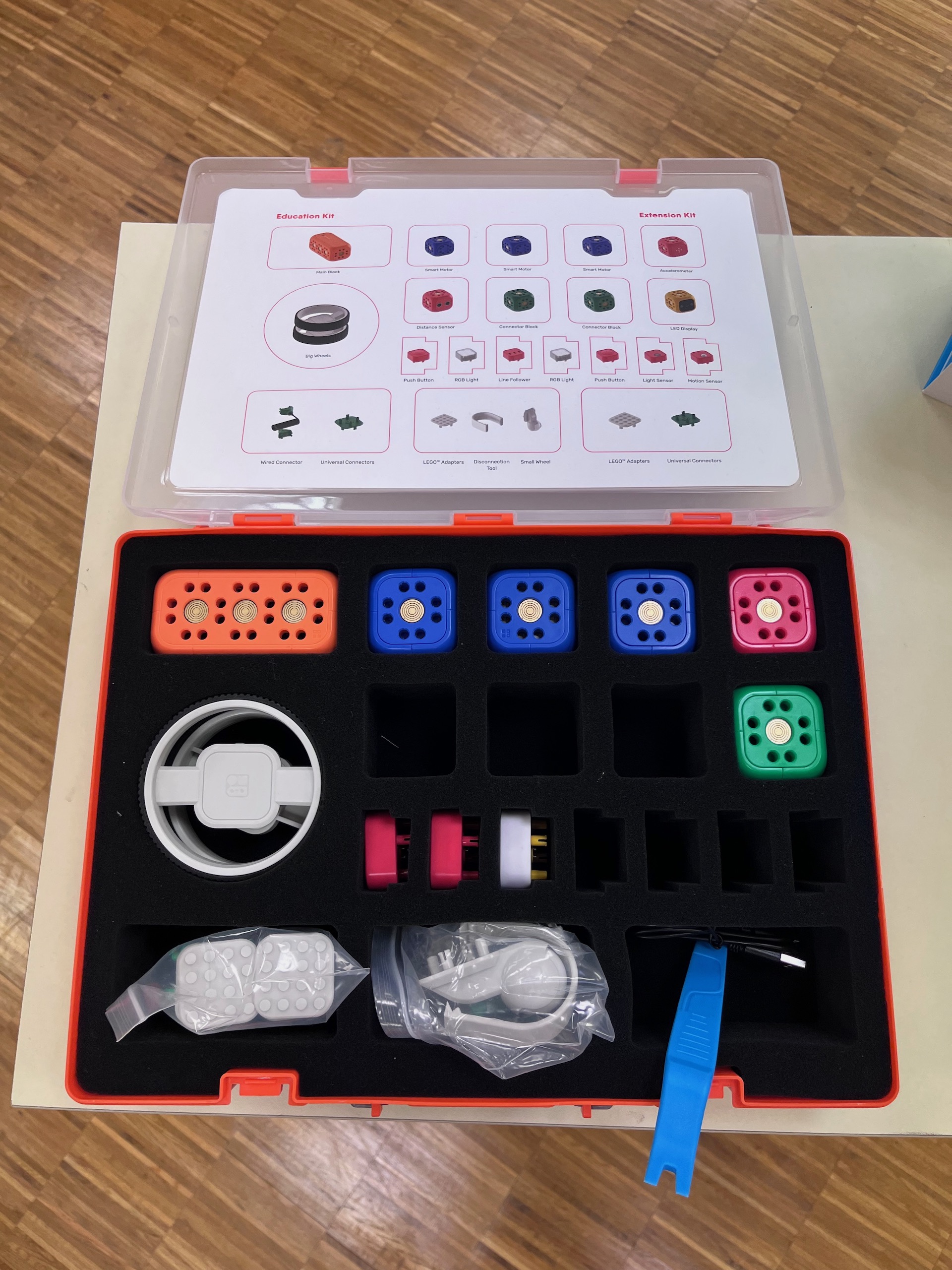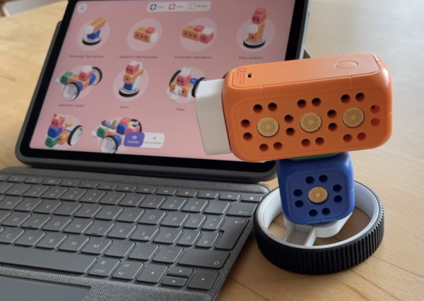Ein Baukastensystem mit farblich codierten Blöcken aus denen die Schüler:innen eigene oder vorgegebene Roboter bauen können. Mit Sensoren und Motoren erwachen die Roboter zum Leben. Mithilfe eines Tablets werden die Roboter gesteuert oder sogar programmiert.